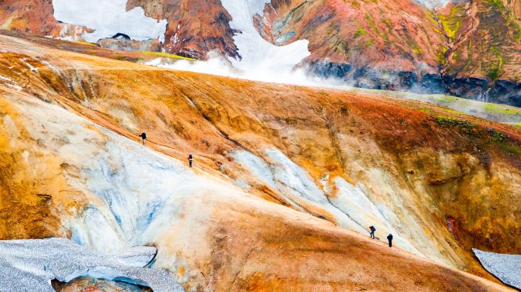 Les amateurs de randonnée du monde entier se rendent chaque année en Islande pour visiter le Laugavegur, un sentier de 55 km de long qui s’étend de la zone volcanique de Landmannalaugar aux glaciers de Thorsmork. Alors que la randonnée sur le Laugavegur prend normalement entre deux et quatre jours, vous pouvez apprécier une partie de sa beauté en seulement une ou deux heures en parcourant la boucle de 4 km du champ de lave de Laugahraun, souvent appelée la boucle de Landmannalaugar ou la « vague de soufre », l’un des meilleurs sentiers de randonnée de Landmannalaugar. Commençant près de la partie nord du camping de Landmannalaugar, ce sentier vous rapproche suffisamment du mont Brennisteinsalda pour que vous puissiez voir et sentir la vapeur qui s’échappe de sa base, avant de faire une boucle et de vous ramener au camping.