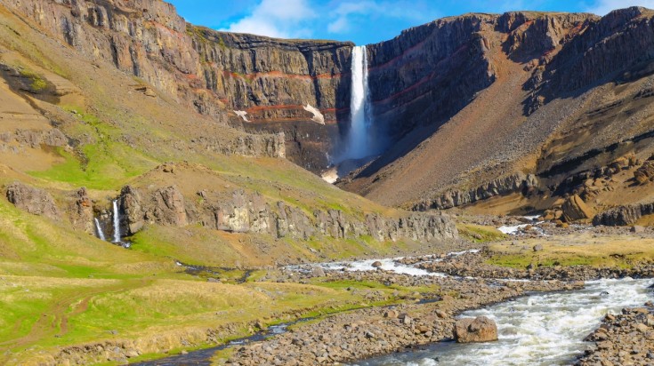 Si vous êtes venu en Islande pour ses chutes d’eau, vous avez de la chance : ce sentier en compte deux ! Hengifoss est une autre chute d’eau qui constitue une excellente randonnée d’une journée. Il s’agit d’un sentier assez populaire, et le parking où la randonnée commence et se termine peut être très fréquenté pendant les mois d’été. La randonnée de 2,5 km commence par une volée de marches, suivie d’un sentier de gravier modérément facile. À mi-chemin, vous pourrez apercevoir au loin la magnifique cascade de Litlanesfoss.
