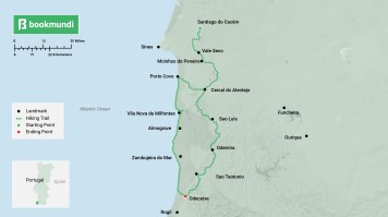 - Début/fin de la randonnée : Santiago do Cacém, Alentejo à Odeceixe, Algarve. Depuis Odeceixe, il est possible de poursuivre sur le sentier des pêcheurs jusqu’à Cabo de São Vicente, ce qui représente 260 km supplémentaires et 11 jours.