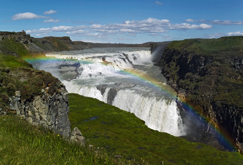 Faisant partie du Cercle d’Or de l’Islande, Gullfoss est probablement la chute d’eau la plus populaire du pays. Il est situé à environ deux heures au nord-est de Reykjavik et on y accède après des arrêts dans le parc national de Þingvellir et aux piscines de boue bouillonnante et aux geysers de Haukadalur, qui forment ensemble le Cercle d’Or. Le nom de la cascade signifie » Cascade dorée « , ce que vous comprendrez si vous visitez la cascade tôt le matin ou en fin d’après-midi lorsque le soleil donne à l’eau un reflet doré. Gullfoss est le plus impressionnant par sa taille car il est constitué de deux larges systèmes de chutes d’eau qui descendent dans un large ravin. Il y a deux sentiers de promenade qui longent la cascade. L’un vous emmène le long du bord de la falaise pour la voir d’en haut, tandis que l’autre monte sur un grand affleurement rocheux qui s’avance dans la cascade. Apparemment, si les pluies sont fortes, l’affleurement peut être submergé dans les eaux courantes.