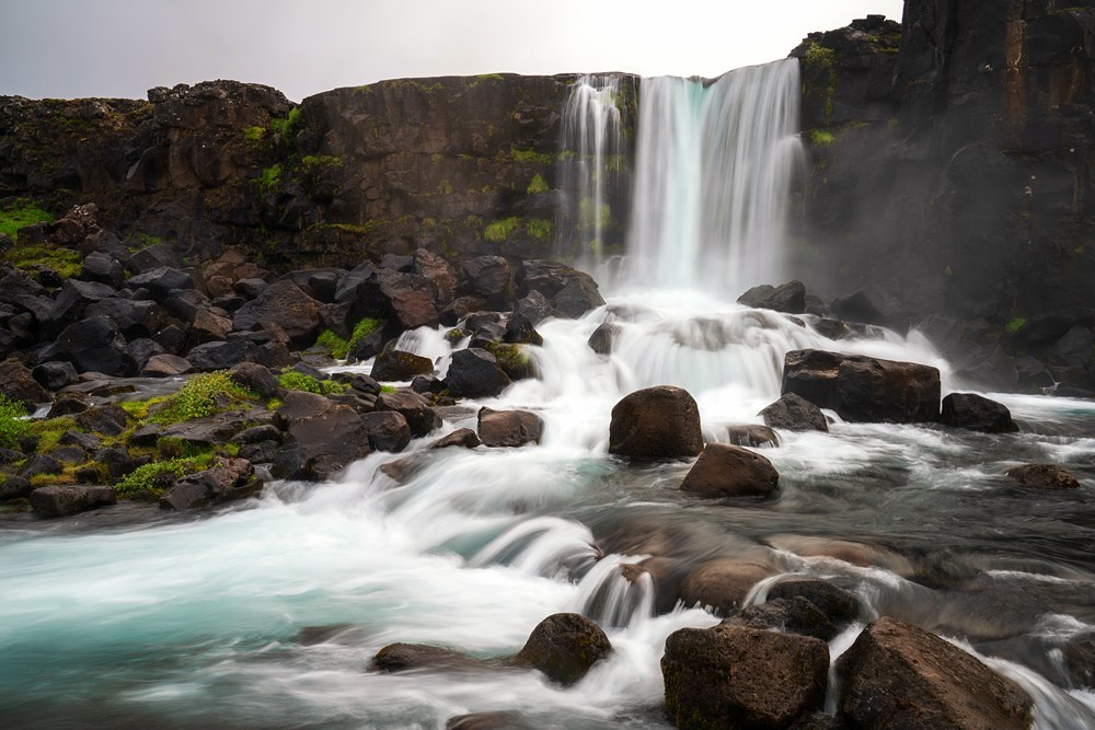Öxarárfoss est situé dans le parc national de Þingvellir (parc national de Thingvellir) et est facile à manquer si vous ne faites pas attention en parcourant le sentier en boucle dans le parc. Si vous vous garez dans le stationnement principal comme le font la plupart des gens et que vous suivez le sentier à travers la faille continentale et que vous continuez tout droit jusqu’à la fin du sentier et un autre stationnement – à environ un kilomètre – vous rencontrerez éventuellement un sentier sinueux menant dans les rochers. Suivez ce sentier et vous atteindrez Öxarárfoss, qui est une belle petite gâterie cachée parmi l’écrasante beauté de Þingvellir. Öxarárfoss n’est pas très grand, mais il se déverse directement de la roche continentale dans un petit bassin, ce qui lui donne une qualité pittoresque. Et le fait qu’il soit relativement éloigné dans le parc signifie que vous pouvez prendre de belles photos sans que trop de gens ne viennent encombrer la vue.