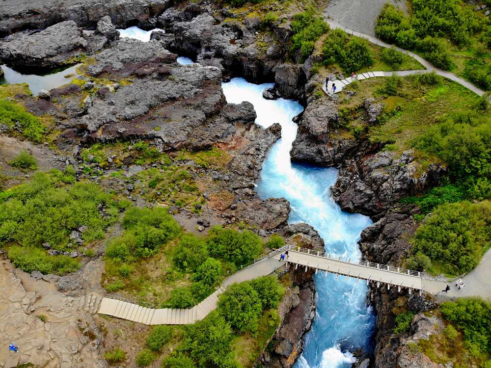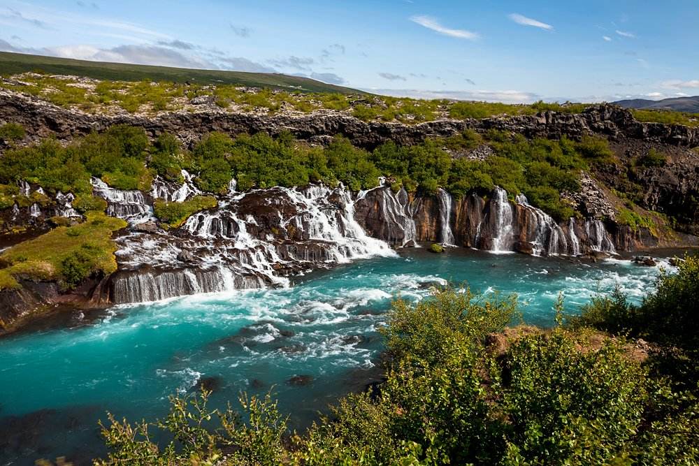 Barnafoss est situé tout près de Hraunfossar, et est accessible par le même parking. Contrairement à Hraunfossar, Barnafoss n’est pas un groupe de petits ruisseaux qui impressionnent par leur impact collectif, mais une puissante chute d’eau au milieu d’une gorge menant à la rivière en contrebas. Il y a un pont qui traverse la gorge et qui permet de profiter d’une bonne vue sur les chutes, ainsi que plusieurs sentiers de randonnée de chaque côté qui offrent différents points de vue. La chute tire son nom d’une histoire d’enfants qui s’éloignaient de leur ferme à l’époque de la colonisation et qui se sont probablement noyés dans les chutes, mais sachez que la chute réelle n’est pas aussi horrible que l’histoire qui lui donne son nom. C’est un endroit magnifique et se combine avec Hraunfossar comme une destination idéale pour une excursion d’une journée.