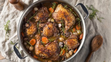 - Le coq au vin est un délicieux plat de poulet que l’on trouve dans presque tous les restaurants français traditionnels. Le succulent poulet est braisé dans du vin rouge et cuit à l’étouffée avec des oignons perlés, de l’ail frais et des pommes de terre. Nous salivons rien qu’à l’idée d’y penser.