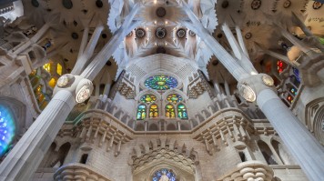 - La nature est un thème esthétique récurrent à la Sagrada Familia. Observez toutes les façons dont Gaudi s’inspire du monde naturel. Repérez la porte verte à motif de feuilles à l’entrée, les colonnes et les fenêtres en forme d’arbre qui constituent le plafond intérieur et les corbeilles de fruits en plâtre qui servent de sommet à la flèche.